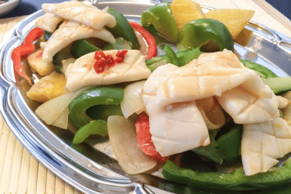 Mực lá xào cà, thơm, rau cần, ớt chuông, hành tây, ... tất cả hòa quyện với nhau thấm hương vị vào từng sớ thịt mực lan tỏa trong miệng kích thích độ ngon