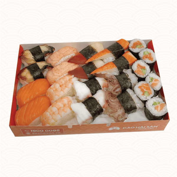 Sushi Mix 10A gồm Maki Cá Hồi, Thanh Cua, Đầu Mực, Sò Đỏ Canada, Bạch Tuộc Nhật, Tôm Thẻ, Bụng Cá Hồi Khè, Lươn Nhật & Cá Hồi Nauy