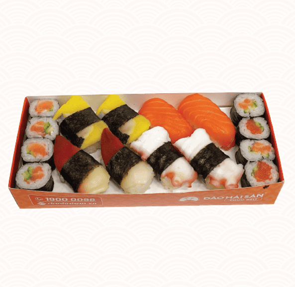 Sushi Mix 4B gồm : Maki Cá Hồi, Sò Đỏ Canada, Cá Trích Ép Trứng, Cá Hồi Nauy & Bạch Tuộc Nhật