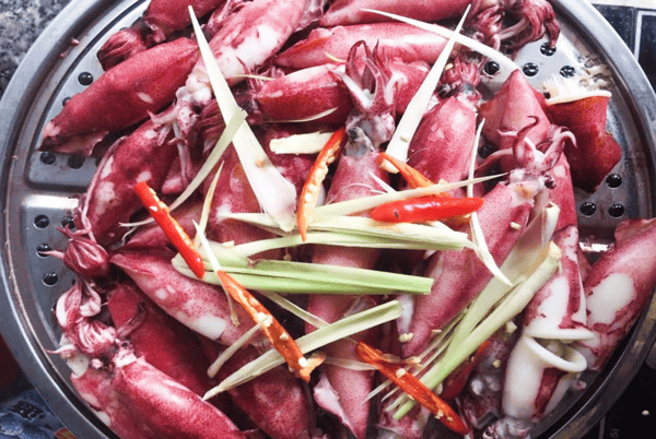 Mực Ghim Trứng hấp hành, hấp gừng hay hấp sả đều thơm ngon.